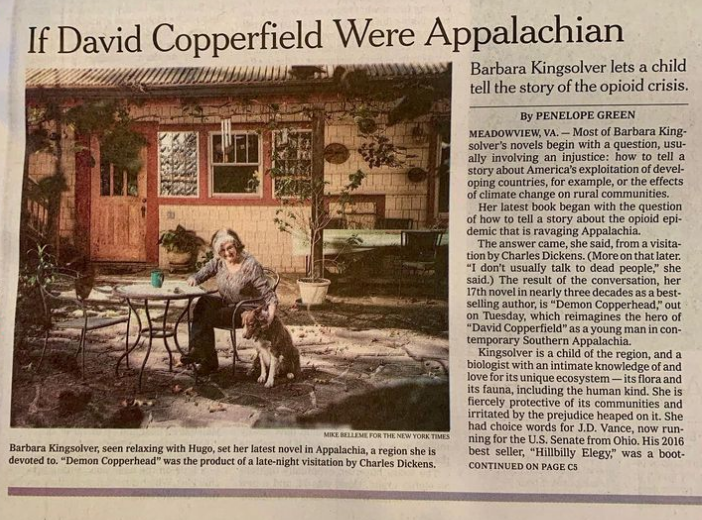 Barbara (and Hugo) were recently featured in a Culture piece by Penelope Green of The New York Times, who came to visit Barbara in her home just before the release of Demon Copperhead. After release of the article, Barbara thanked Penelope: “for seeing and hearing Appalachia and getting everything right. (Hugo was also pleased, and proudly confirms that he did, indeed, smell faintly of skunk.)”